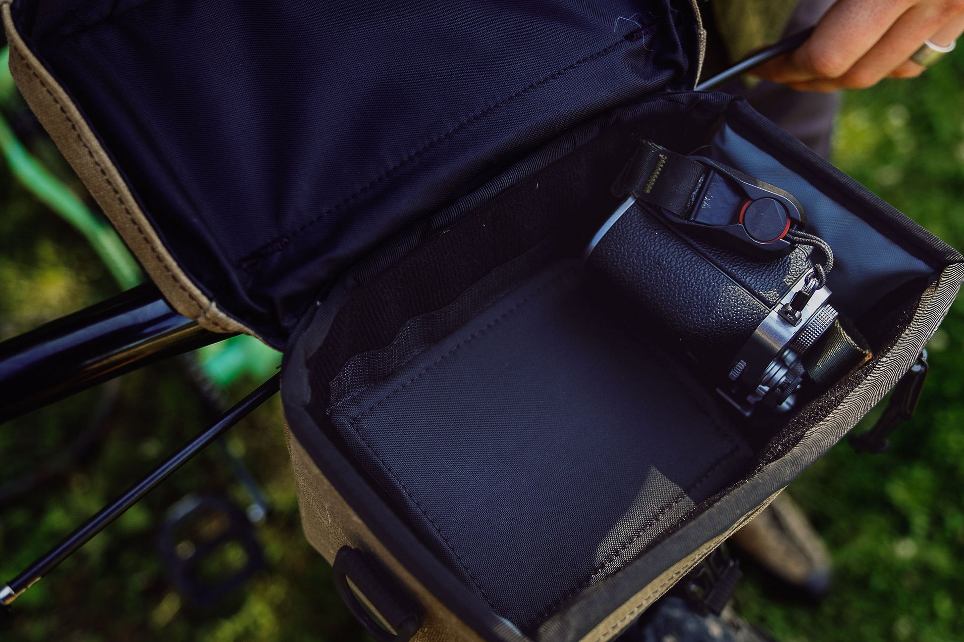 The Viewfinder is a camera pack that performs equally well on or off the bike. We sized this pack to be a perfect point-and-shoot companion, with a little extra room for a second lens, flash, or other goodies. All sides of the pack are padded, and the interior gives your sensitive electronics hugs, not scratches. Need a divider to keep things tidy? That comes standard. Need a strap? We've got you covered. And did we mention it's compatible with Peak Design Anchor Links? Yep, sure is. And when it's off the bike, the handlebar straps fold flat on the back of the pack so they're out of the way and out of your life.